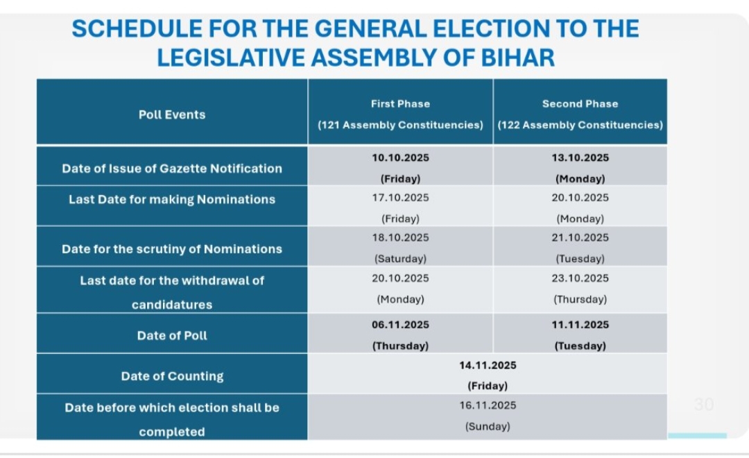 बिहार जनमत। बिहार का विधानसभा चुनाव दो चरणों में कराया जाएगा। पहले चरण की वोटिंग 6 नवंबर को और दूसरे चरण की वोटिंग 11 नवंबर को होगी। 14 नवंबर को बिहार विधानसभा चुनाव के नतीजे आएंगे।