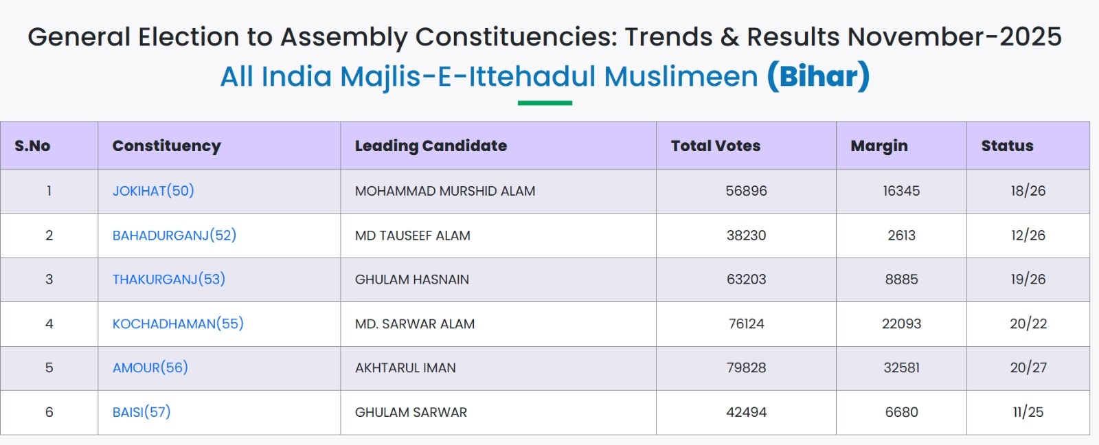 बिहार जनमत। बिहार चुनाव में एनडीए ने बड़ा खेल कर दिया है, एनडीए को इस बार 200 से ज्यादा सीटें मिली हैं। वहीं महागठबंधन को बड़ा नुकसान होता दिख रहा है। इसी बीच असदुद्दीन ओवैसी की पार्टी ऑल इंडिया मजलिस-ए-इत्तेहादुल मुस्लिमीन (AIMIM) ने भी सीमांचल में अच्छा प्रदर्शन किया है। यहां की कुल 24 सीटों में से 6 सीटों पर AIMIM आगे चलती रही और अंत में पांच सीटों पर जीत दर्ज कराई। वहीं बाकी कुछ सीटों पर भी पार्टी ने अच्छा प्रदर्शन किया है।