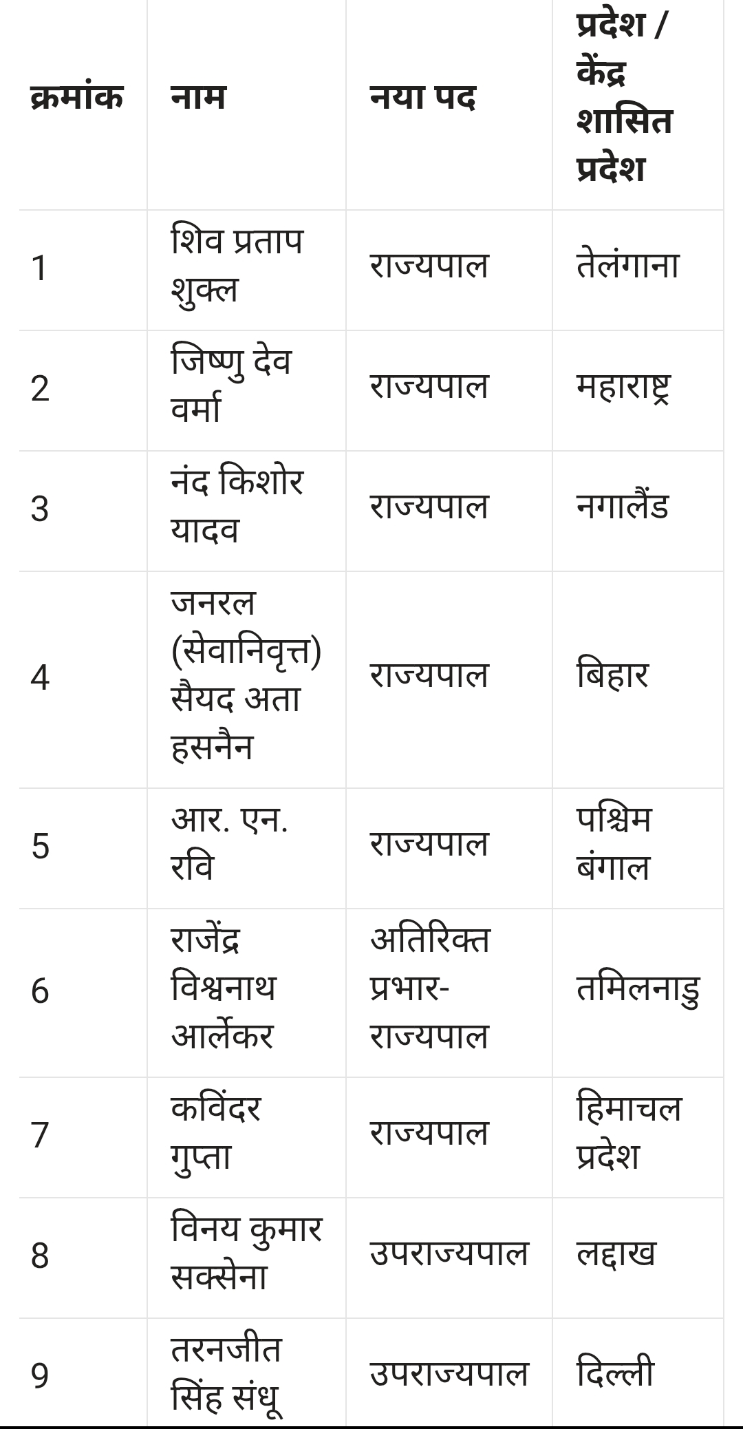 राष्ट्रपति की ओर से जारी आदेश के अनुसार हिमाचल प्रदेश के राज्यपाल शिव प्रताप शुक्ल को अब तेलंगाना का राज्यपाल बनाया गया है। वहीं तेलंगाना के राज्यपाल जिष्णु देव वर्मा को महाराष्ट्र का राज्यपाल नियुक्त किया गया है। इसके अलावा बिहार में पूर्व सैन्य अधिकारी जनरल (सेवानिवृत्त) सैयद अता हसनैन को राज्यपाल बनाया गया है। नागालैंड में नंद किशोर यादव को नया राज्यपाल नियुक्त किया गया है।