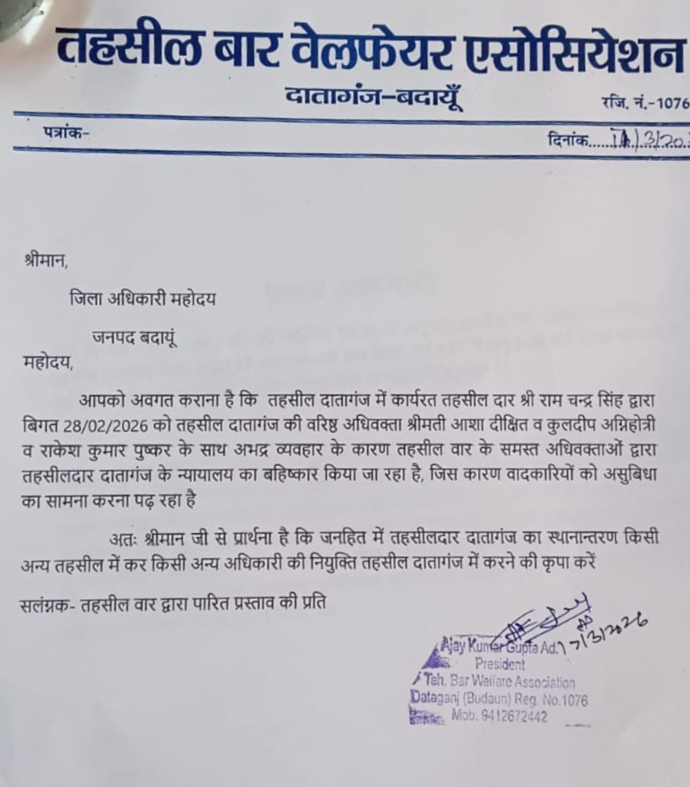 उन्होंने कहा तहसीलदार दातागंज का रवैया अधिवक्ताओं एवं आम जनता के प्रति संतोषजनक नहीं है। उनकी कार्यशैली एक अधिकारी की न होकर राजनेता की है। बार की पूर्व अध्यक्षा आशा दिक्षित, कुलदीप अग्निहोत्री एवं राकेश पुष्कर के साथ हुए दुर्व्यवहार के कारण तहसीलदार दातागंज न्यायालय का निरंतर बहिष्कार चल रहा है। जिससे वाद कारियों को परेशानी का सामना करना पड़ रहा है। अधिवक्ताओं ने तहसीलदार की कार्य प्रणाली की जांच एवं उनके शीघ्र स्थानांतरण की मांग डीएम के समक्ष रखी। जिसके बाद डीएम ने उचित कार्रवाई का आश्वासन दिया।