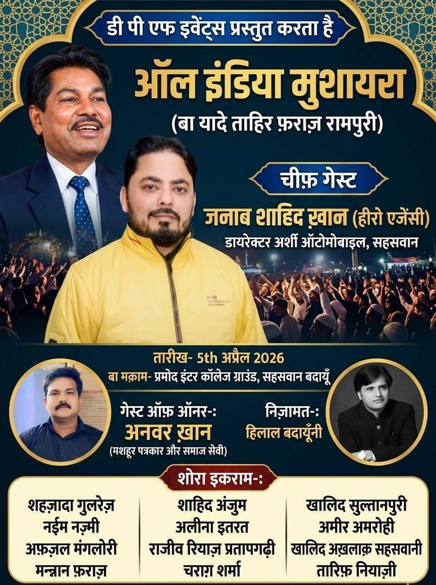 बदायूॅं जनमत। सहसवान क्षेत्र में चल रहे सद्भावना मेले के तहत पांच अप्रैल को एक भव्य ‘ऑल इंडिया मुशायरा’ का आयोजन किया जाएगा। यह कार्यक्रम मरहूम शायर ताहिर फ़राज़ रामपुरी की याद में आयोजित किया जा रहा है। आयोजकों के अनुसार यह मुशायरा प्रमोद संस्कृत महाविद्यालय के मैदान में आयोजित होगा। जिसमें देश के विभिन्न हिस्सों से नामचीन शायर अपनी शायरी पेश करेंगे। कार्यक्रम में मुख्य अतिथि के रूप में शाहिद खान सपा प्रदेश सचिव व डायरेक्टर अर्शी ऑटोमोबाइल हीरो एजेंसी सहसवान शामिल होंगे। जबकि विशिष्ट अतिथि के रूप में अनवर खान पत्रकार व समाज सेवी मौजूद रहेंगे। कार्यक्रम की निजामत हिलाल बदायूंनी करेंगे।